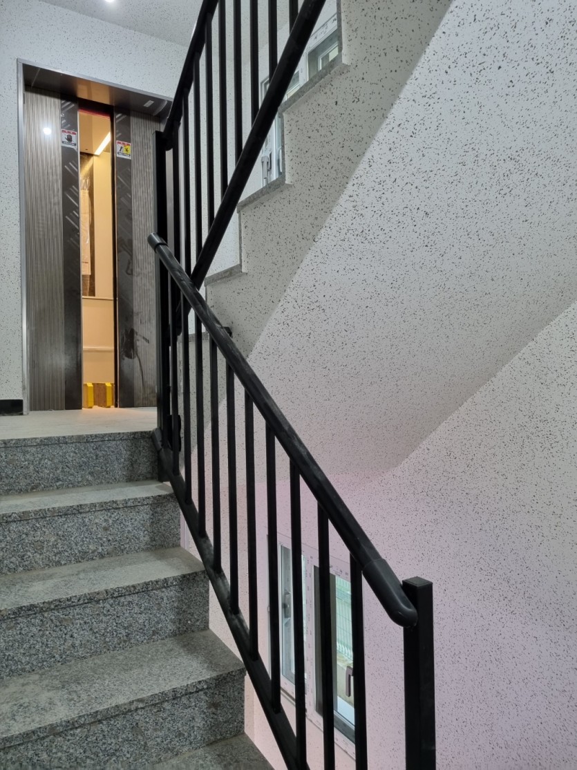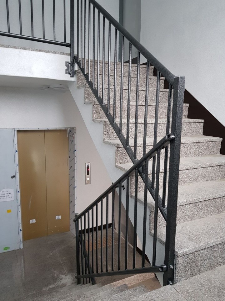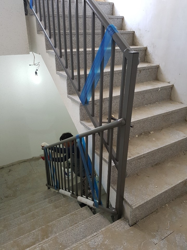 계단폭 확보를 위한 측면 시공법 입니다. 윗방향 아랫방향의 간살이 하나의 기둥에 설치가 되며,
